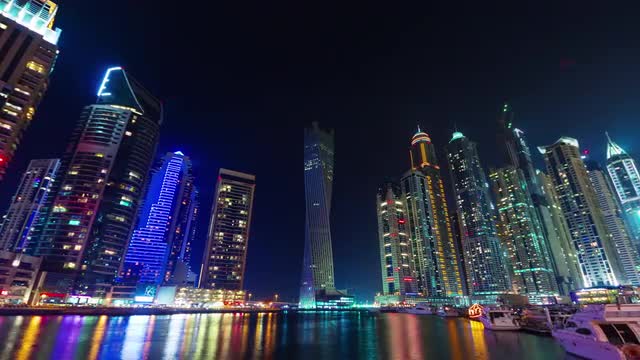 dubai marina night illumination yacht dock panorama 4k time laps eunited arab emirates