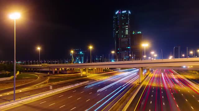 > dubai city night illumination traffic road junction 4k time lapse uae