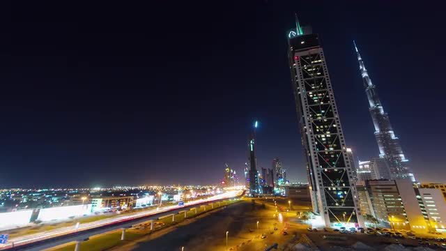 > night illumination dubai business bay traffic road panorama 4k time lapse uae