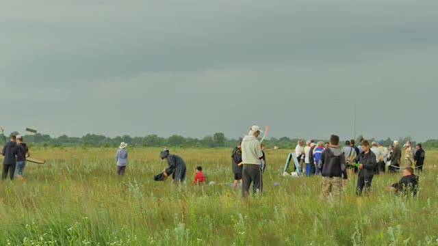 Kiev/ukraine - Jun 22 2016: Teenagers Preparing to Model Aircraft Sports Competitions Outdoors, Green Field in Konotop, Ukraine. Lightning in the Sky. Interested Young People Are Walking, Standing, Sitting on a Grass. Preparation to Launching of Flying Aircraft Models. Kids' Technical Art. Aircraft Model Assembly Before Starting. Aircraft Model Launching. Estimation of Airplane Model Flight. Jury is Estimating the Start and Flight of the Airplane. Cloudscape, Horizon, Fresh Green Grass. Cloudy Day