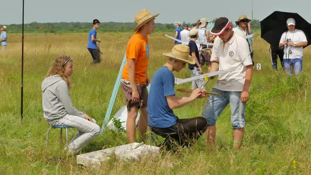 Boys Are Launching Rubber Aircraft Models. the Airplane is Flying, People at Aircraft Model Sports Competition Outdoors. Green Field in Konotop, Ukraine. Preparation For Launching the Airplane Models. Kids' Technical Art. Models Assembly Before the Start. Airplane Launching. Estimation of the Aircraft Flight. Jury is Estimating the Start and Flight of the Airplane Model. Scene in Cloudy Summer Day.