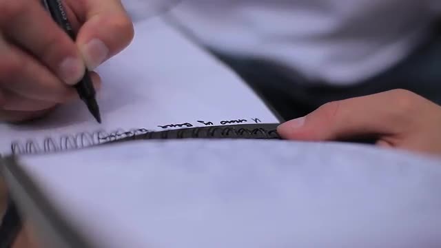 > Man's Hand Writing in a Notebook on His Lap in the Street