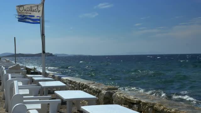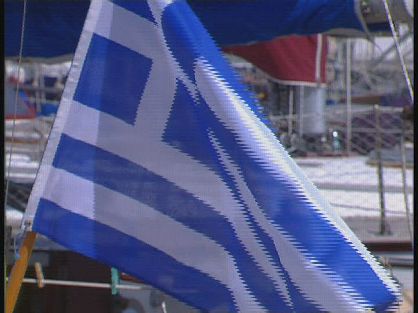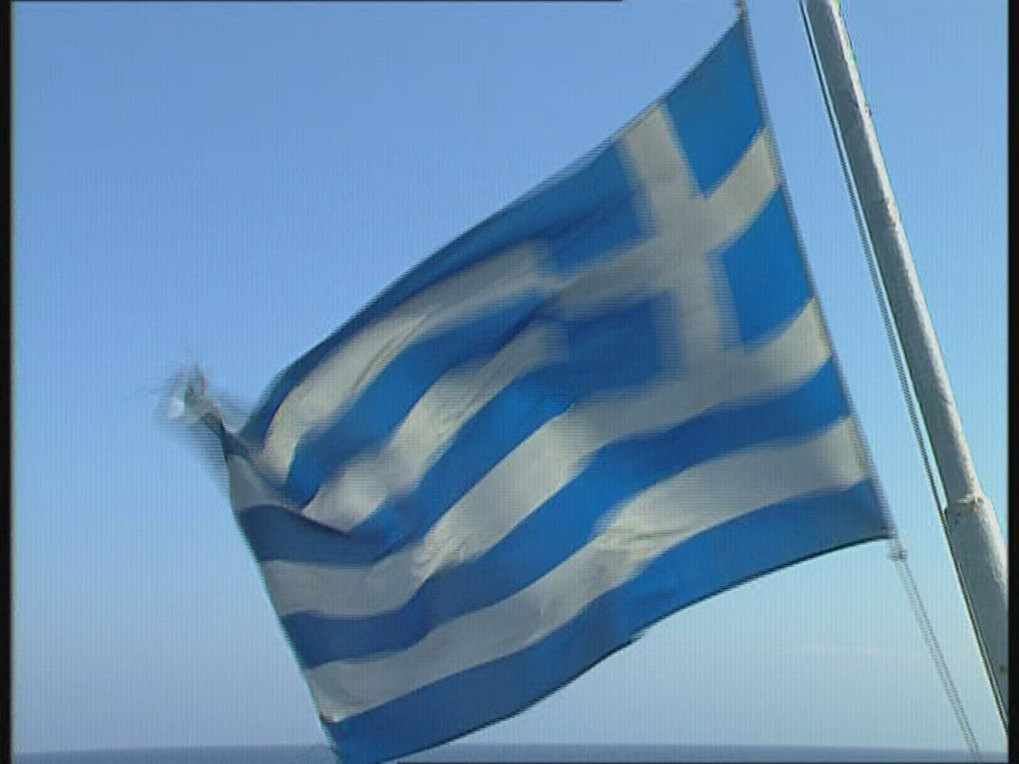 Greece flag with fabric structure waving in wind against sun sky and flying seagull