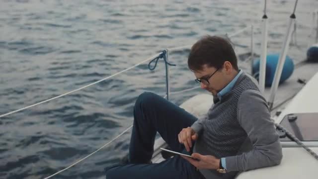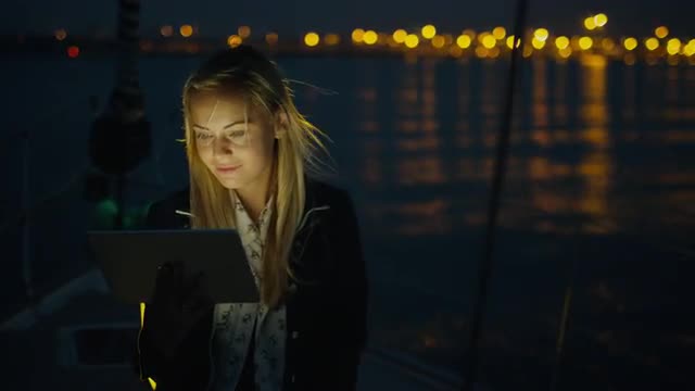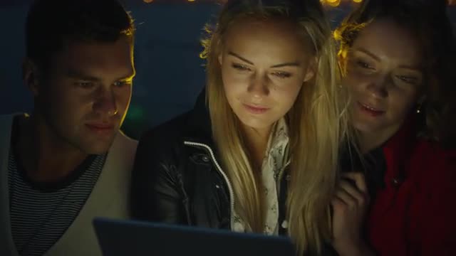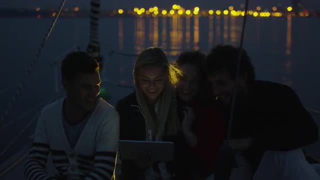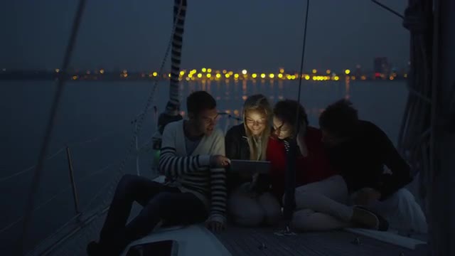 Attractive young travelling couple is using tablet and speaking on dock in sunset