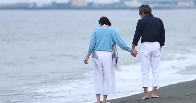 Steadicam shot of senior man and woman holding hands and walking to the water. They enjoying sunset over sea in hugs