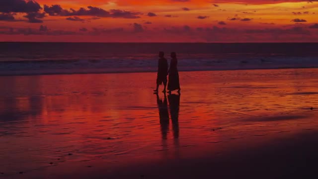 Steadicam shot of grandparents and parents with little son coming to the sea to see golden sunset. Young and senior families enojying the scene