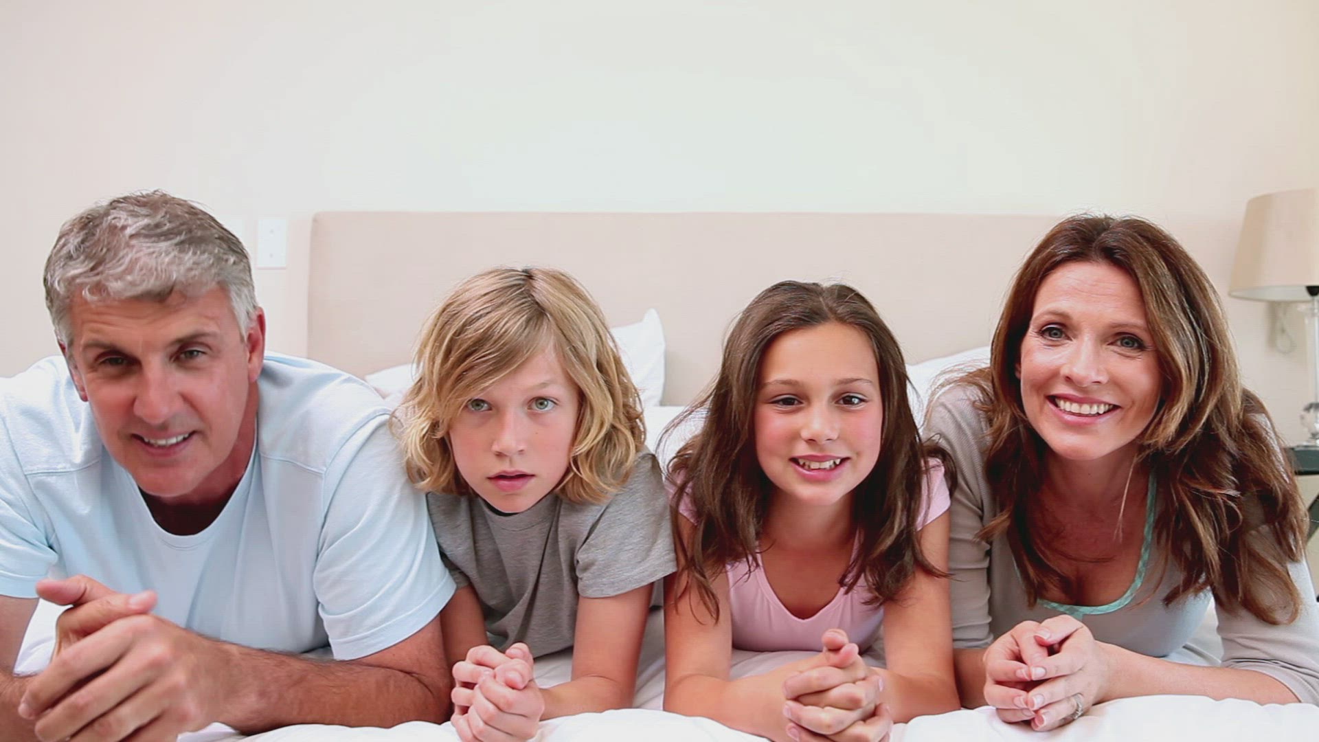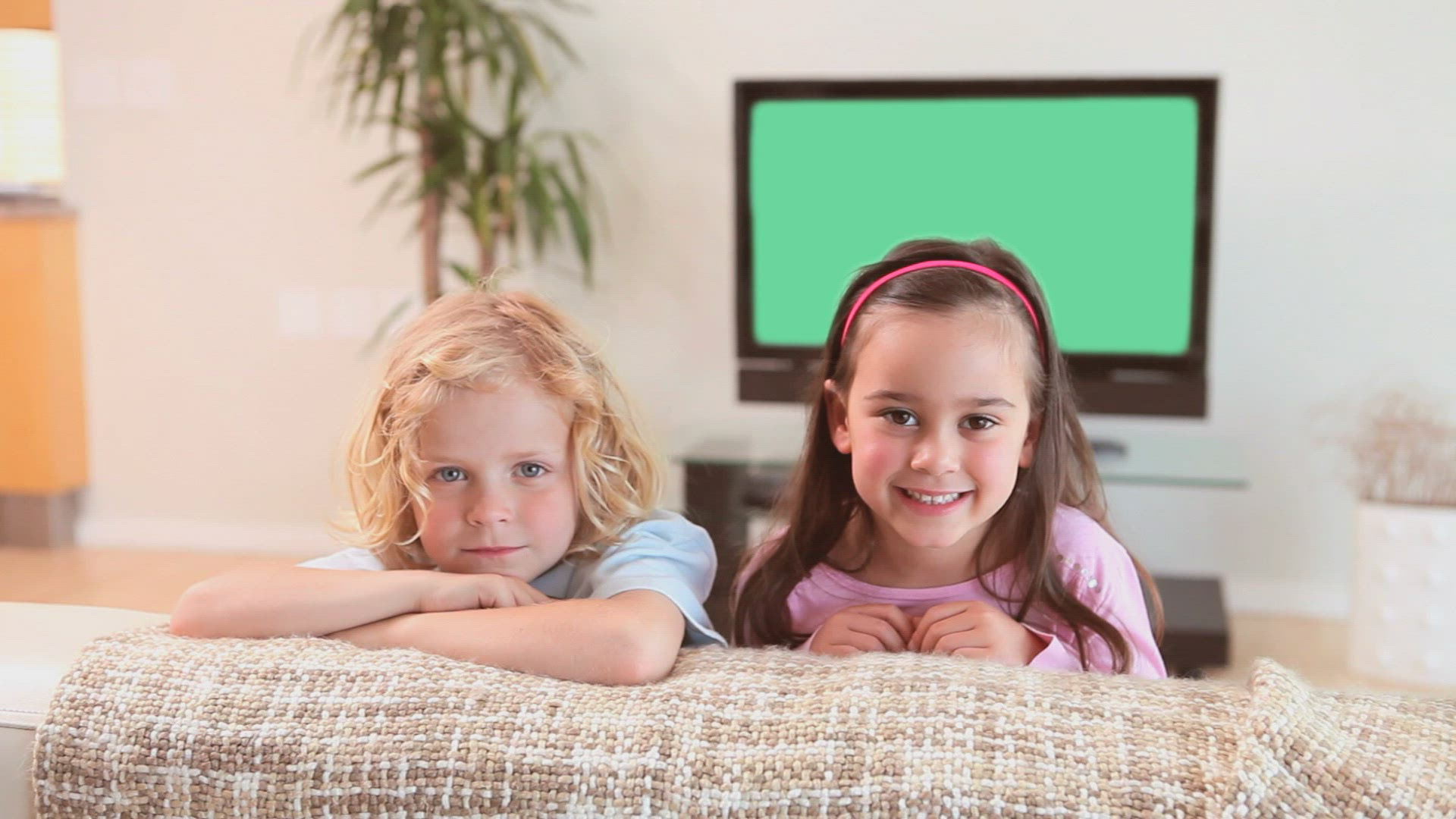Back view of a family with child, parents and grandparents sitting on the sofa at home and watching TV in the evening. Chroma key with tracking motion markers