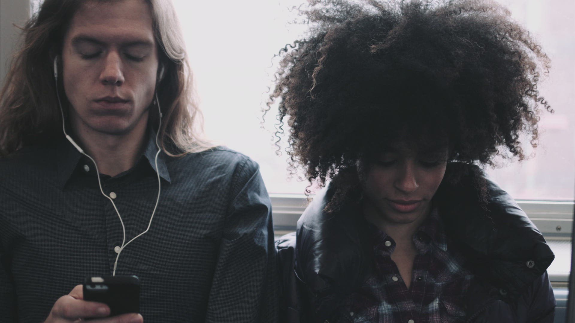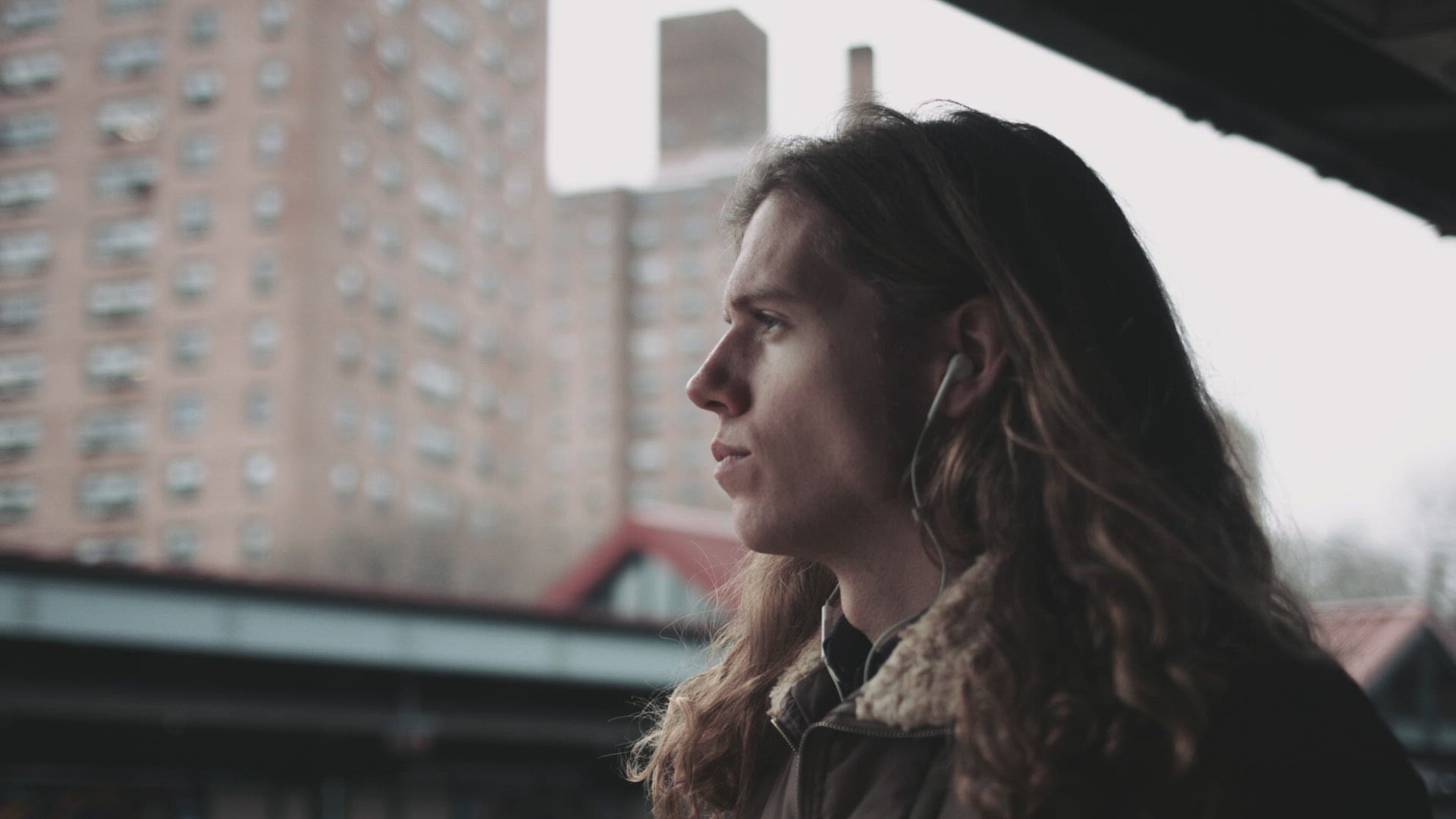 Young blond woman with sad look listening to music in headphones at subway station, trains passing by
