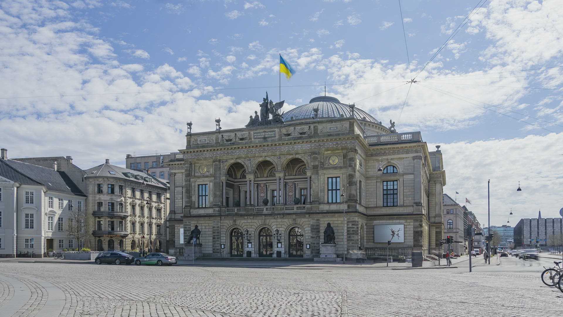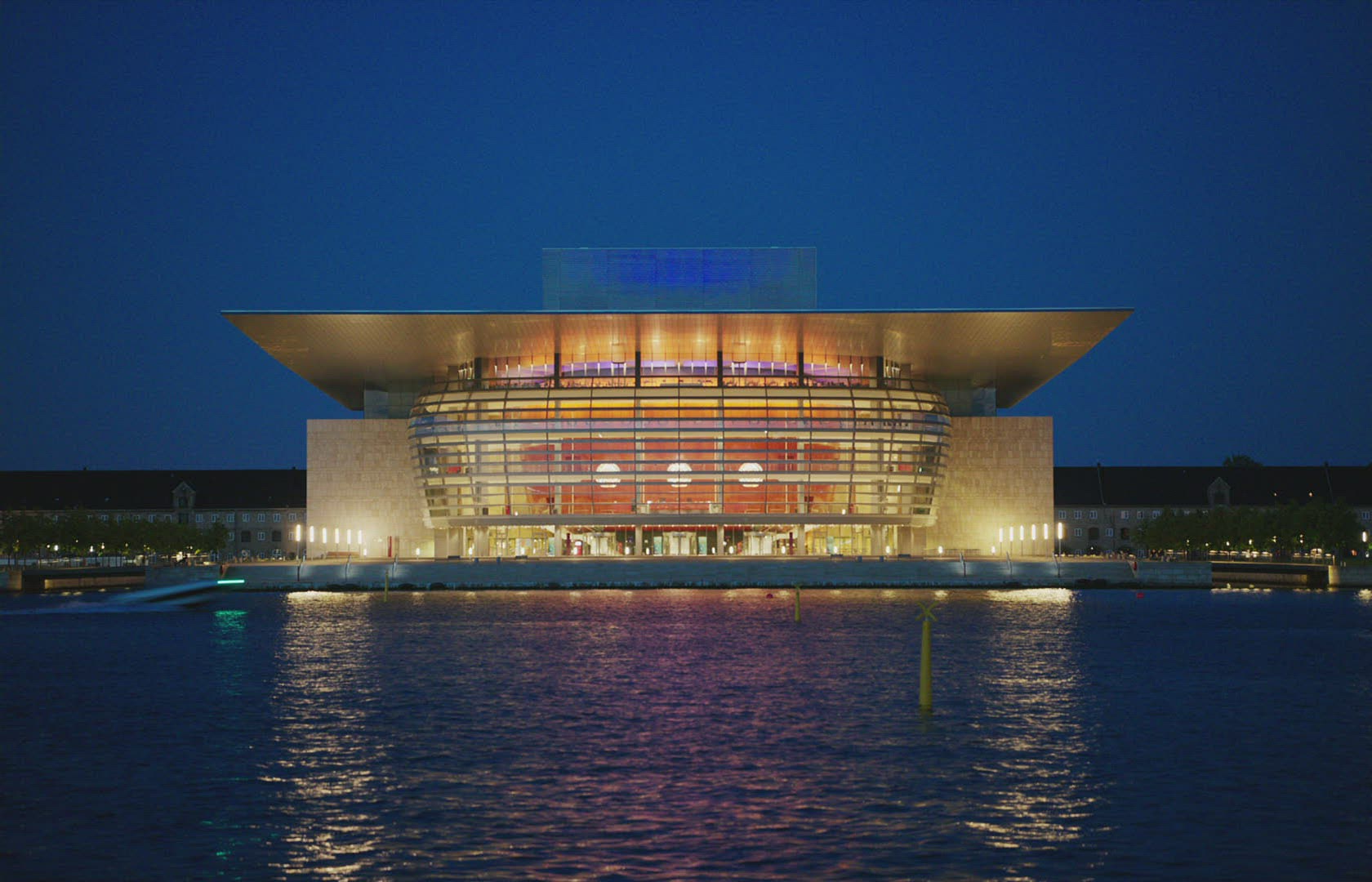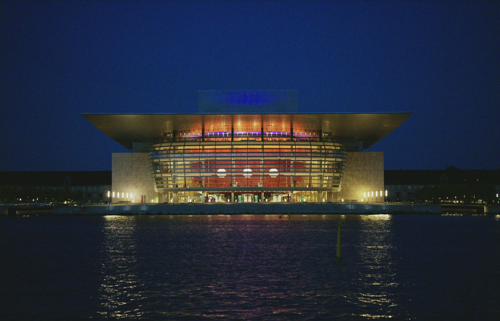 The Copenhagen Opera House at the shore of the harbour at sunset. Modern building with glassy facade and golden sunlight reflecting in it