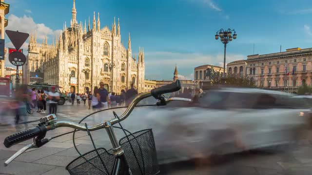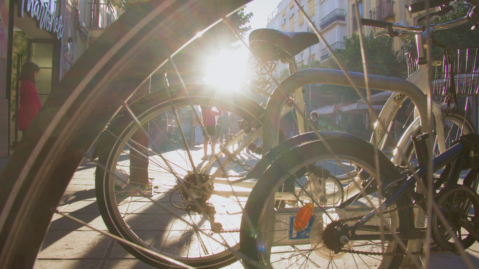 Crowd of unidentified people walking in city street, focus on parked bicycles in foreground