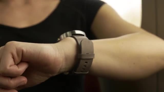 Young blond woman sitting by the window in train and using smart watch with pen