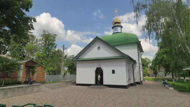 > Holy Cross Cathedral Poltava City Green Roofed Church Sunny Day Courtyard Footpaths Paving Flower Be