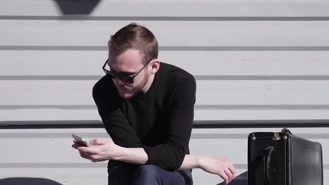 Cinemagraph Loop Handsome Guy in Sunglasses is Typing Text on the Smartphone