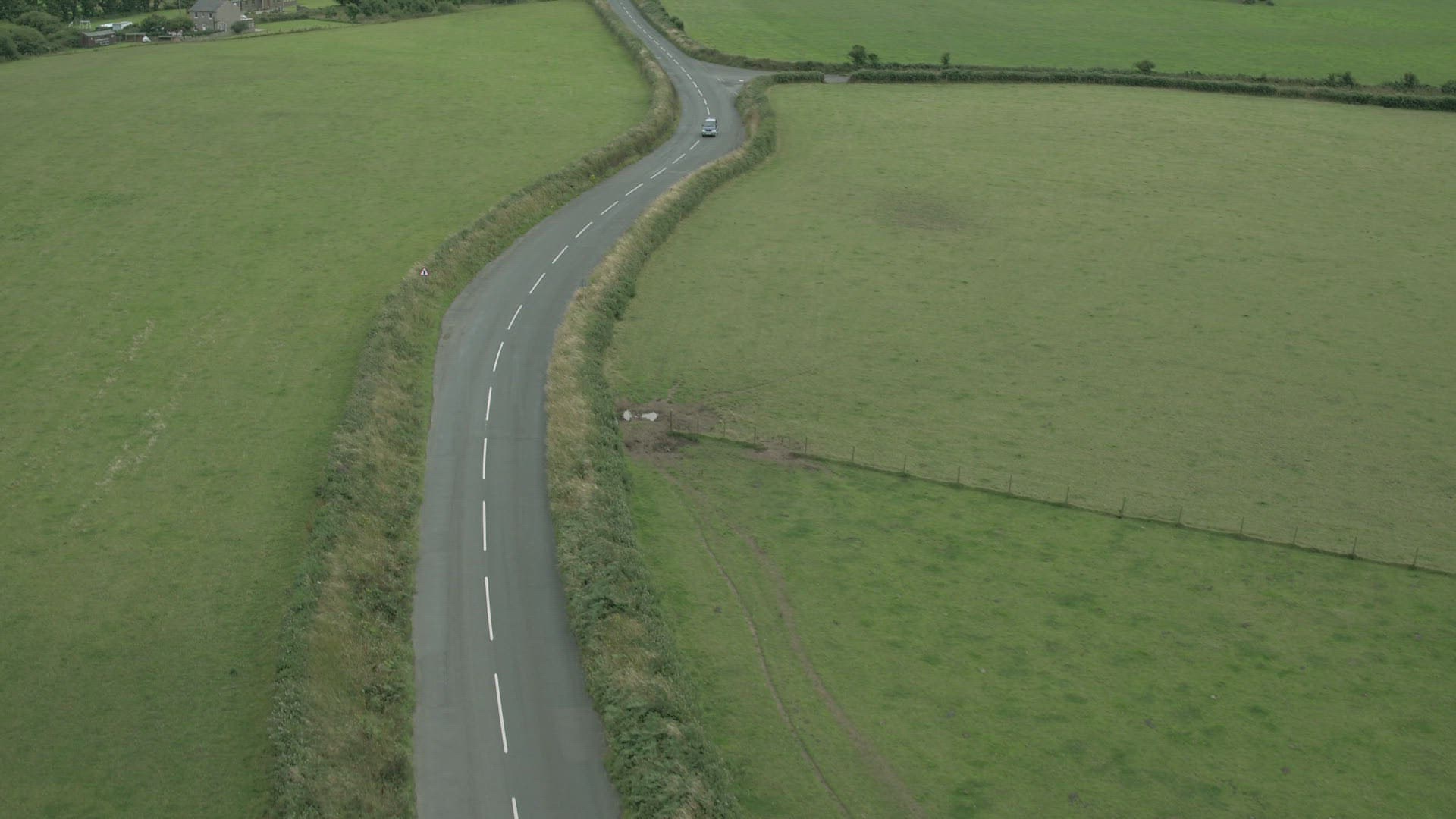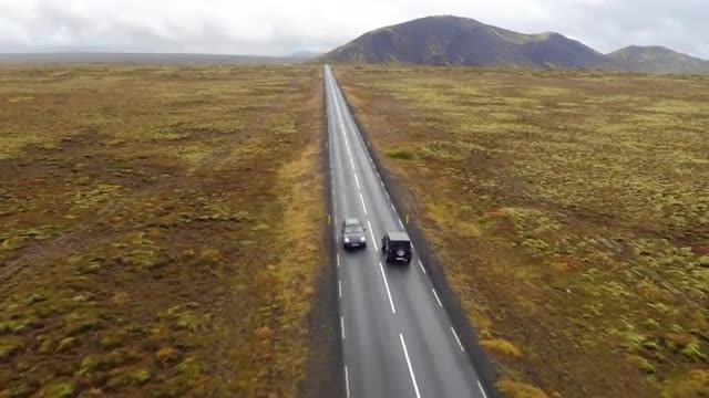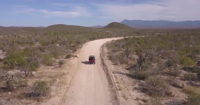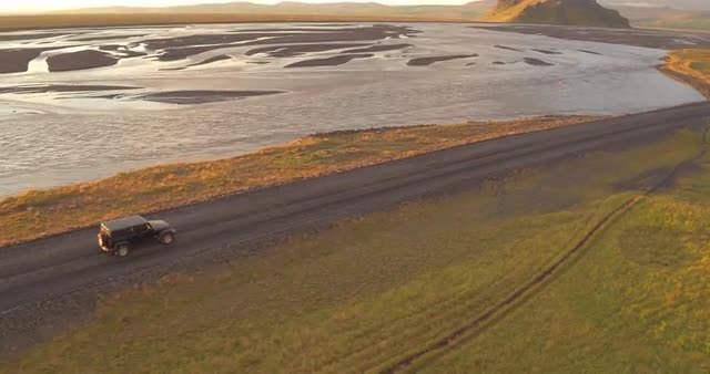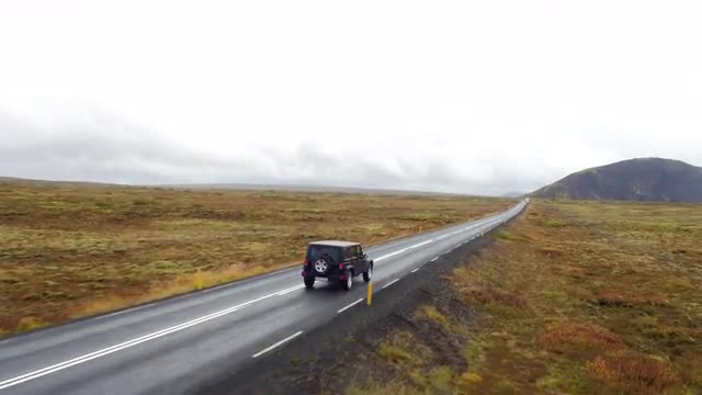 An aerial shot of a jeep driving across the Montana countryside with mountains in the background.