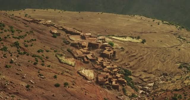 POV WS Aerial view of a small village and fields in the mountainous region of north Morocco, Africa