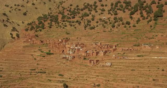 POV WS Aerial view of a small village and fields in the mountainous region of north Morocco, Africa
