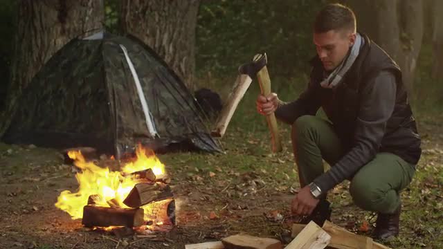 > Coffee Maker Boiling on a Campfire in the Foggy Forest. Coffee is Boiling on the Bonfire in the Coff