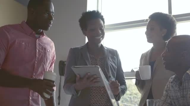 > Businessman talking to co-worker then leaving office at quitting time