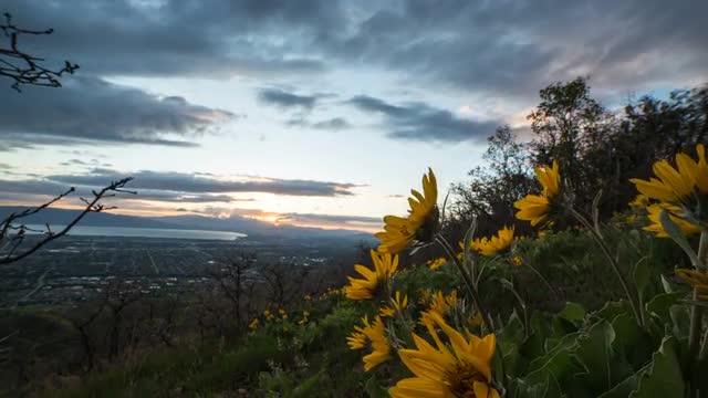 Time lapse moving past yellow flowers at sunset overlooking valley