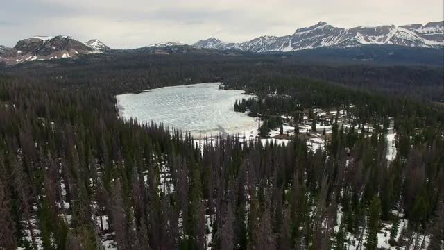 Flying view over a frozen forest in the mountains as snow and ice are slowly melting into Spring.