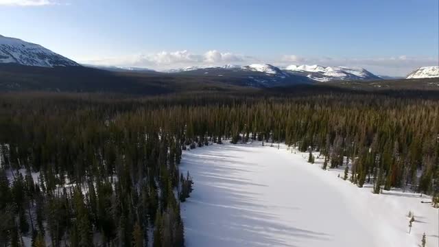 Flying view over a frozen forest in the mountains as snow and ice are slowly melting into Spring.