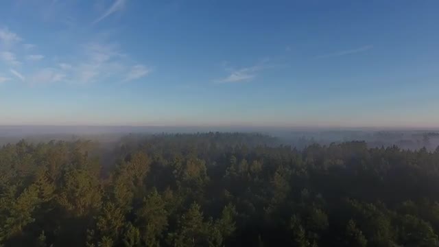 > Drone flight over foggy forest during dawn