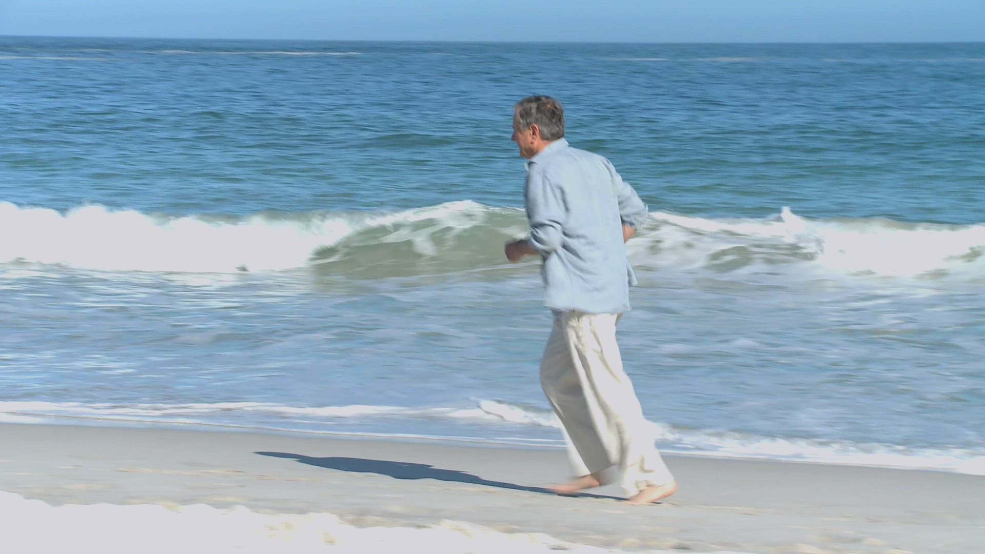 > Senior man enters sea waves