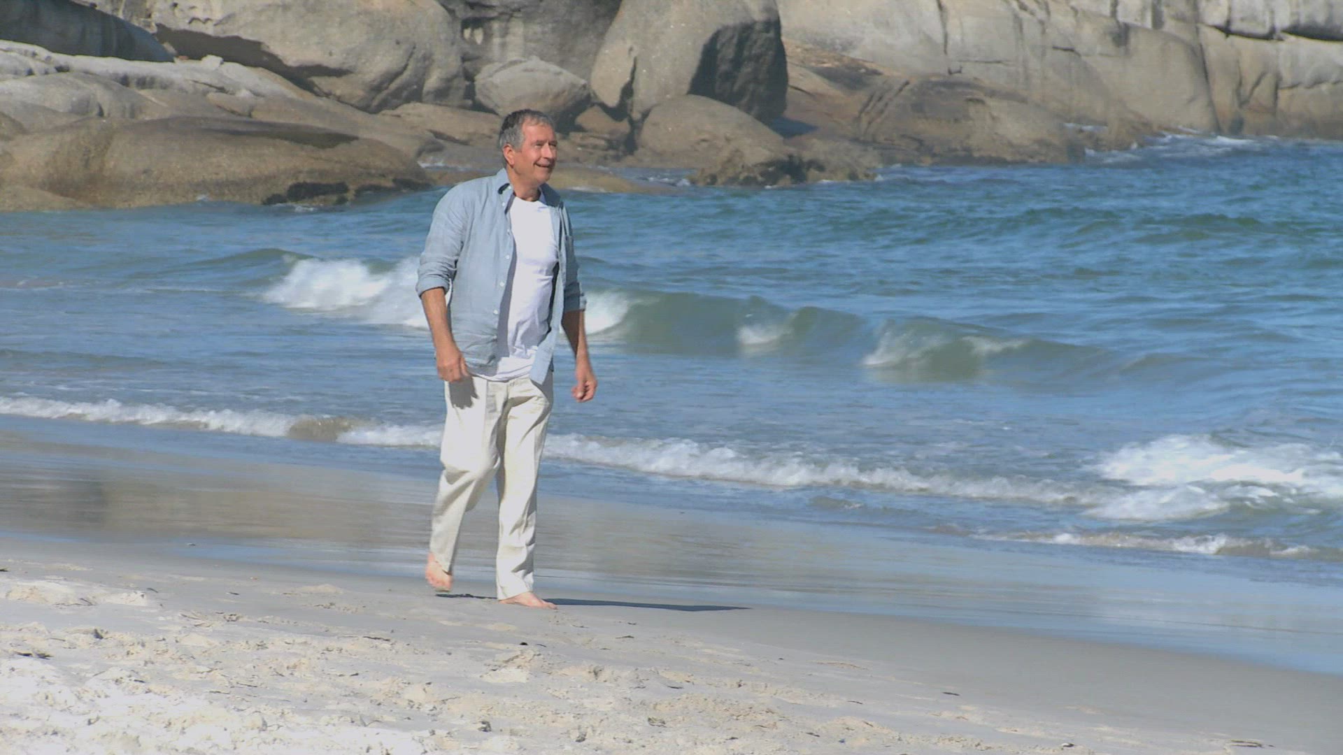 Senior man enters sea waves