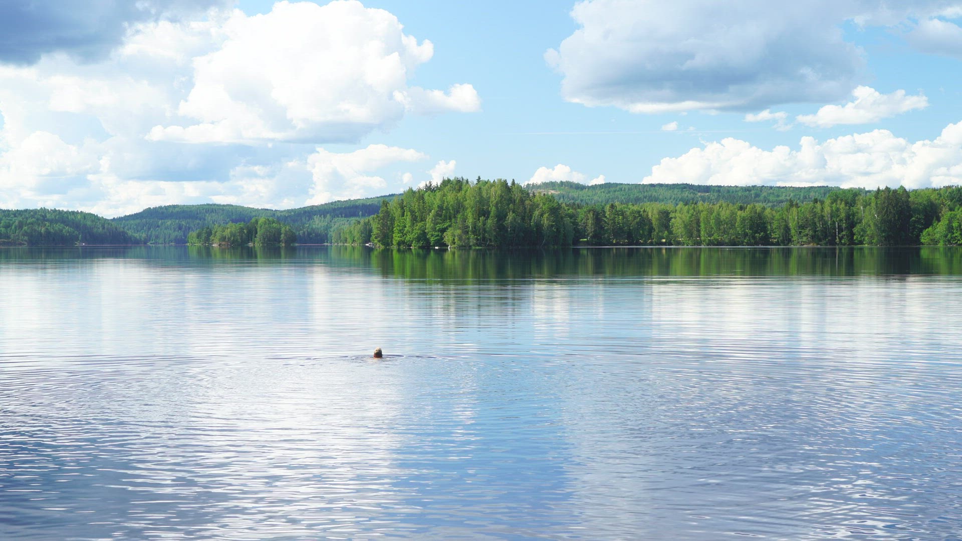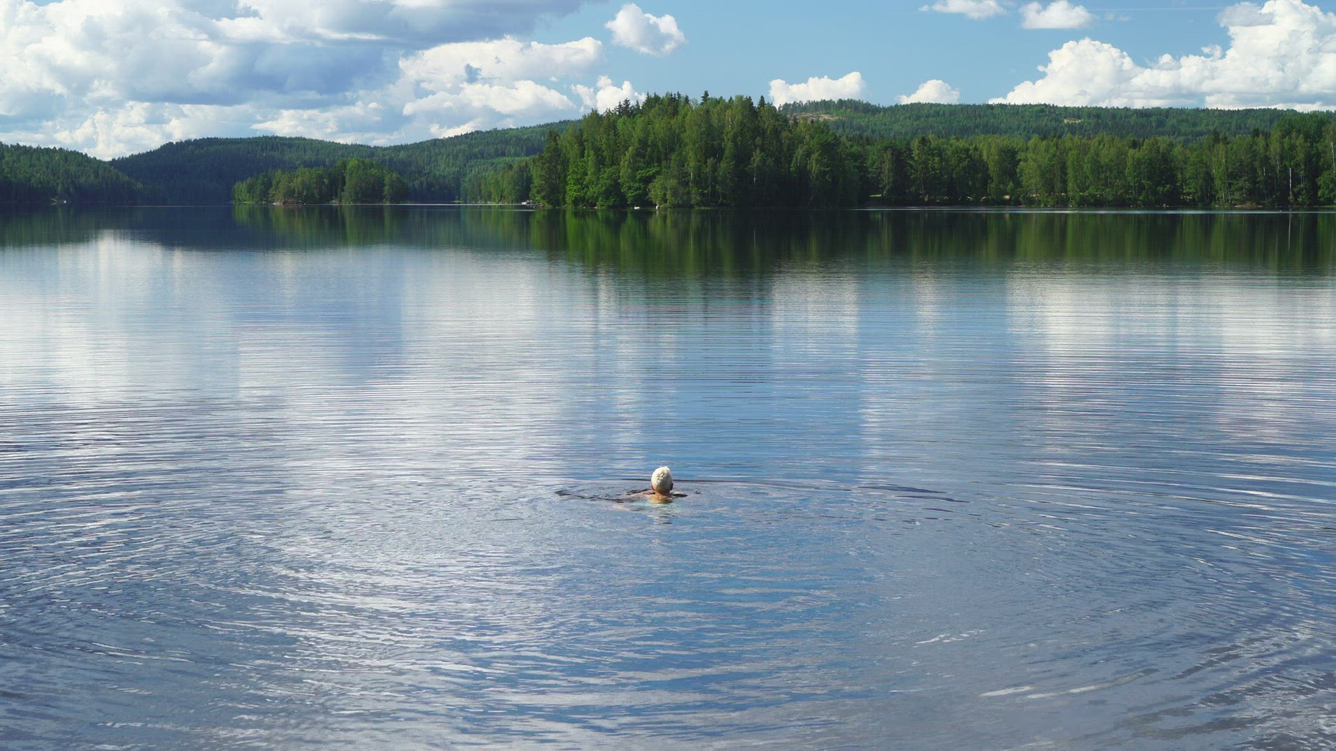 2127718 - boy swimming in mirror lake with surface - forests in background