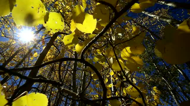 View of Aspen leaves in Fall with Sun Flares as the wind blows.