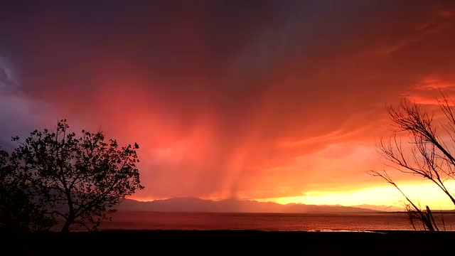 Colorful Sunset overlooking Utah Lake as a small rainstorm moves past with a lightning strike above.
