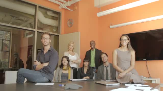 > Creative millennial business people using notes on wall in meeting
