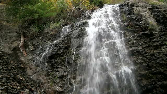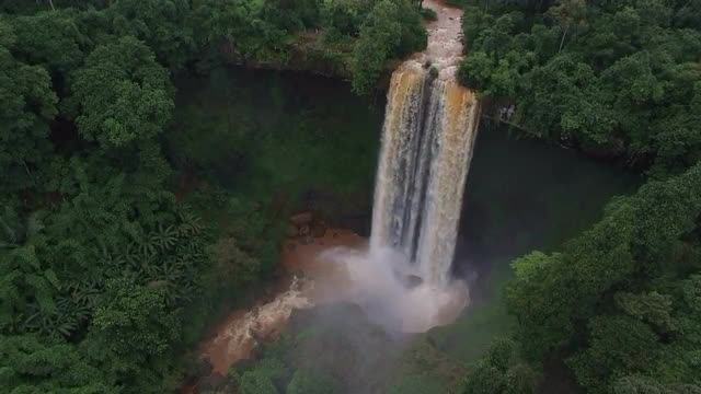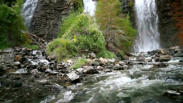 Waterfall split into multiple streams as it all flows back into one river.