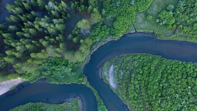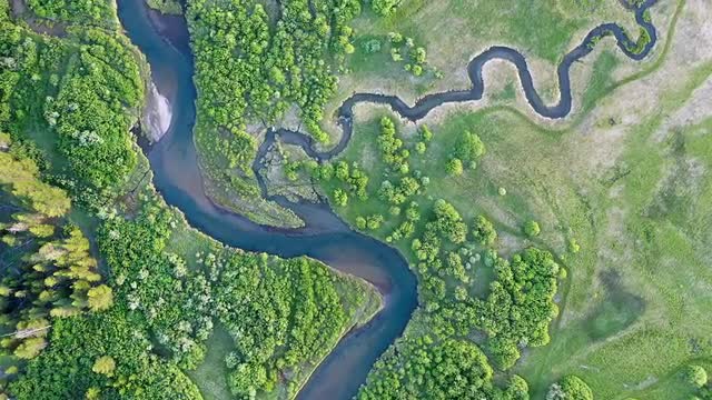 1075300 - Top down view of river winding through green meadow