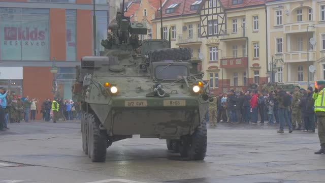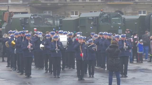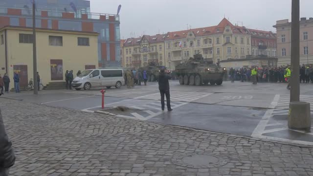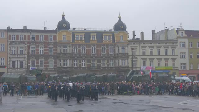 Opole/poland - Mar 11 2016: Polish Military Orchestra is Walking at Ceremonial Meeting, Atlantic Resolve Operation in Poland, Opole. the Band is Playing Music at the Meeting. People Are Listening, Walking by City Square. Families, Kids Are Watching the Event. Collective Security of Nato, Multinational Training, U.s.-European Strategic Partnership, Peacekeeping Mission of Nato, Military Equipment in a City, Martial Law, Cloudy Rainy Day Outdoors