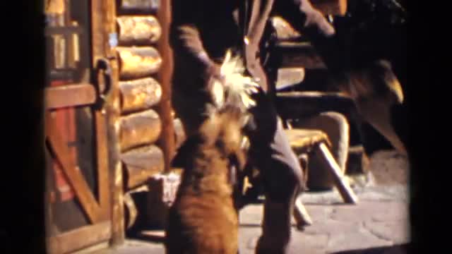1961: man sitting holding two dogs and then dogs jump down IOWA