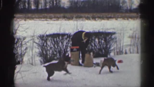 > 1961: man sitting holding two dogs and then dogs jump down IOWA