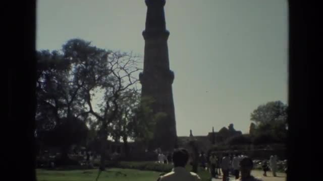 1974: people walking on what looks like a university campus with a very tall stone tower in the back