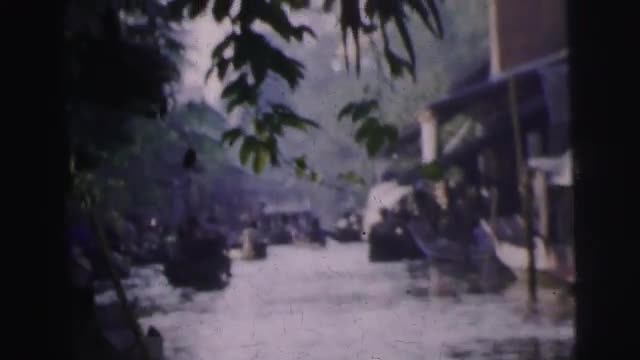 > 1962: rowing on the water past various river merchants displaying their goods BANGKOK, THAILAND