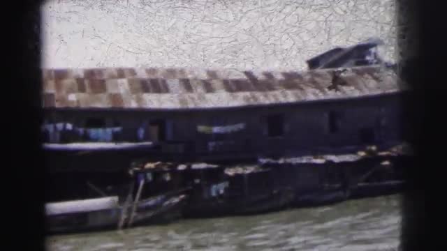 > 1962: view of industrial shoreline from river with people working BANGKOK, THAILAND