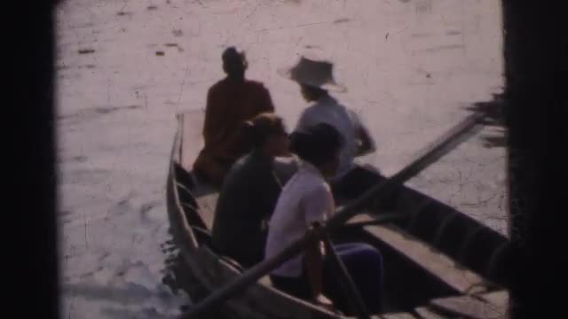 > 1962: man navigating a small wooden boat through the water loaded with four people BANGKOK, THAILAND