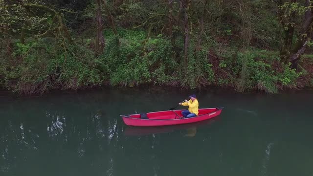 > Man rides a bike near lake