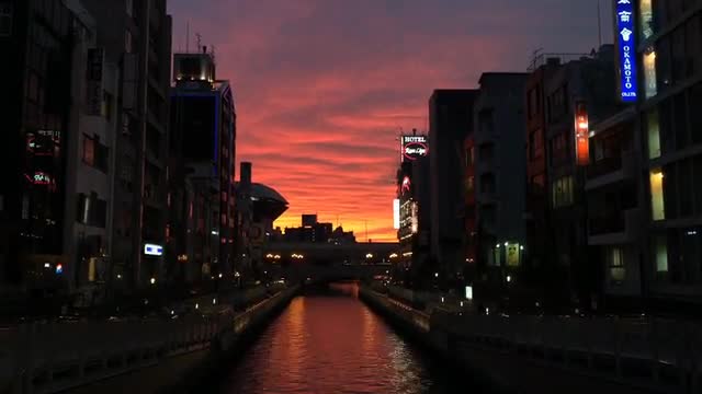 Still timelapse of canal surrounded by buildings and reflecting the sunset.
