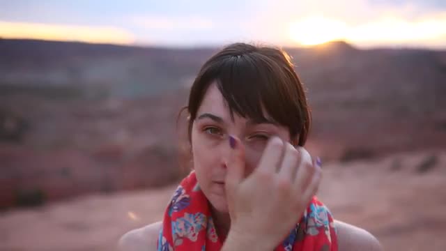 Young woman fixes her bangs in the Mojave Desert, California.