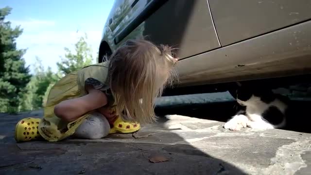 Cute Little Girl Play With a Cat Under the Car. Children and Pets