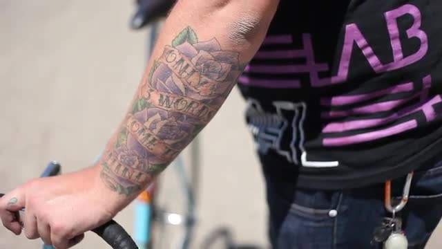 A man nervously waits beside his bike on a bright sunny day in the city.