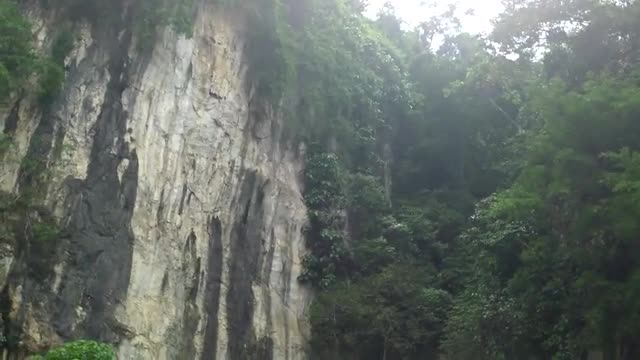 Trees, and large rock cliffs next to a temple in Vietnam.