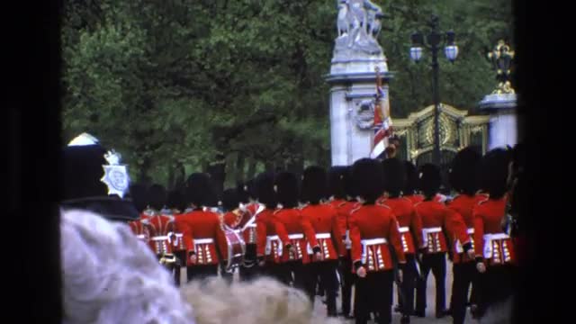 > 1969: a musical band is seen marching with a red uniform ENGLAND
