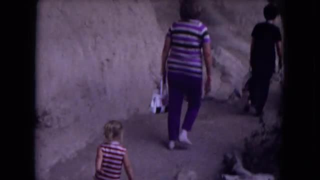 > 1973: people wander down sparsely vegetated mountain path at day NEW MEXICO