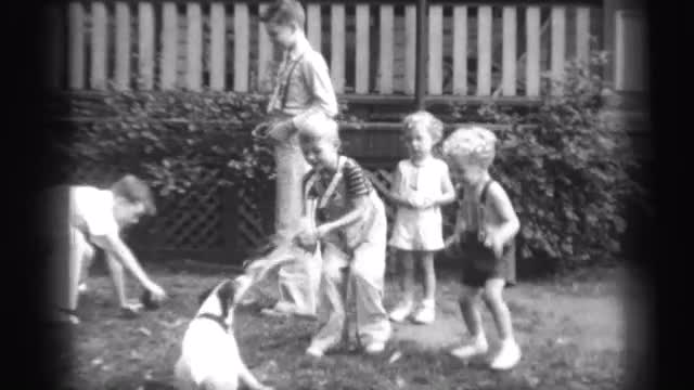 > 1961: a kid is seen posing while a dog plays with a ball TOLEDO, OHIO